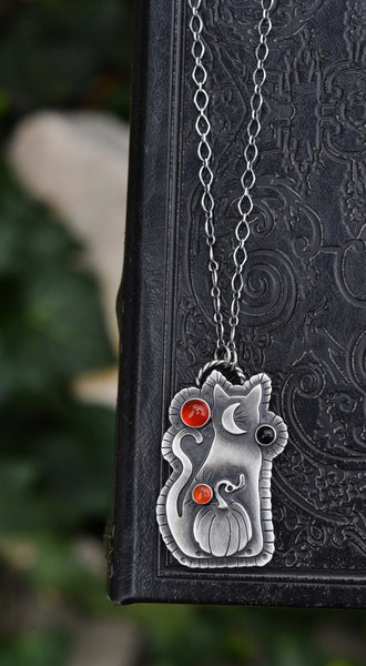 This cat lovers pendant boasts 2 really amazing carnelian that glow, as well as a black onyx. The reverse side is detailed with a mouse perched on a crescent moon.
